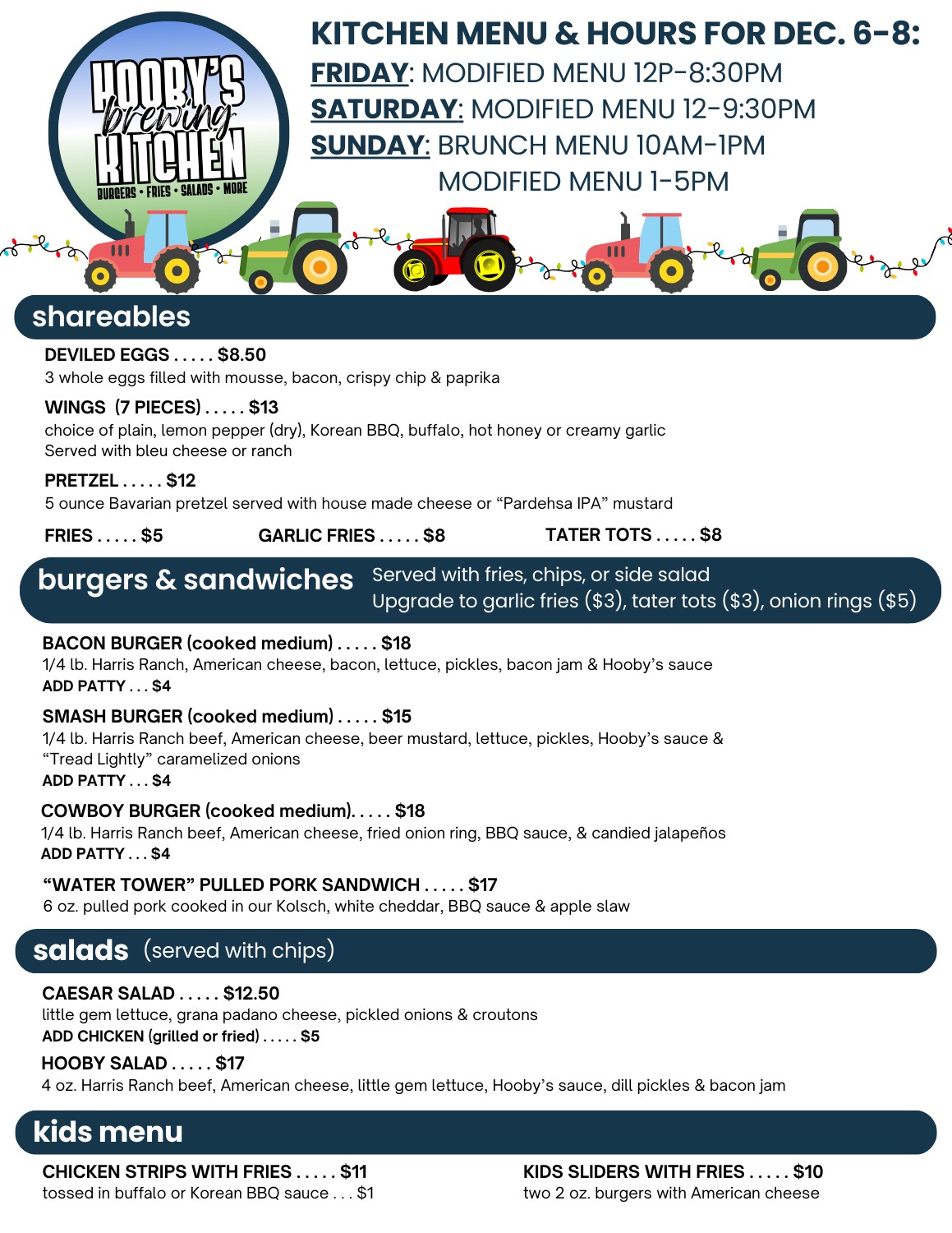 We are adjusting our hours and kitchen menus in conjunction with the annual Downtown Winters Tractor Parade & Tree Lighting Festivities! Be sure to check out the images below to know what we’re serving up Friday, December 6th thru Sunday, December 8th.
